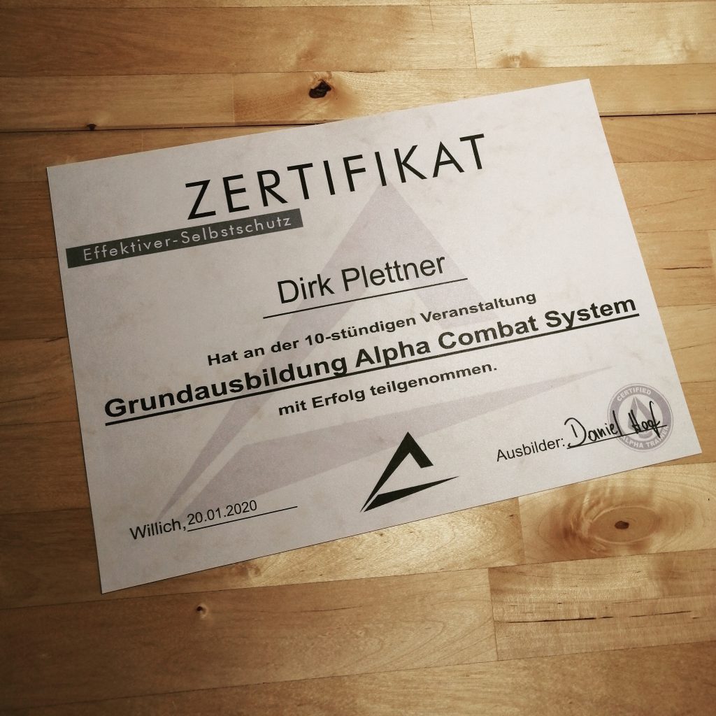 Heute ging es um die Abwehr von Messerbedrohungen. Wie verhalte ich mich, wenn mir ein Messer an den Hals gehalten wird. Und diesmal sowohl im stehen, als auch am Boden. Vor dem Training gab es das Zertifikat zur Alpha Combat Grundausbildung.