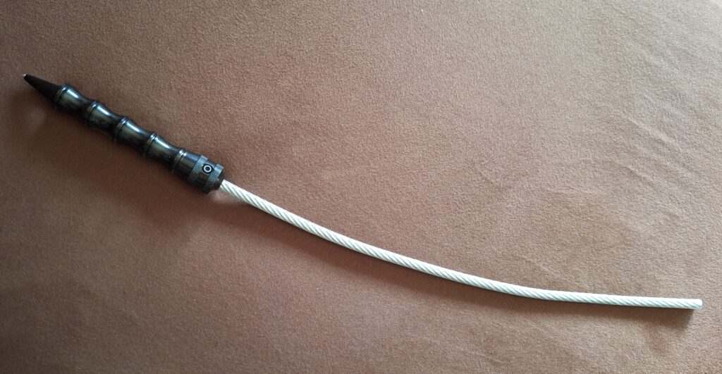 Die taktische Peitsche ist ein Stahlseil, am Ende mit einem Griff. In meinem Fall mit einem Glasbrecher versehen. Oft wird sie als „Nofallwerkzeug für Kraftfahrzeuge“ verkauft, die im Falle eines Unfalls das verlassen des Fahrzeugs auch bei verklemmten Türen sicherstellen soll. Tatsächlich ist dies aber eine Waffe, die nicht öffentlich geführt werden darf. Und Achtung, auch der zugriffsbereite Transport im Auto ist auch öffentliches führen!