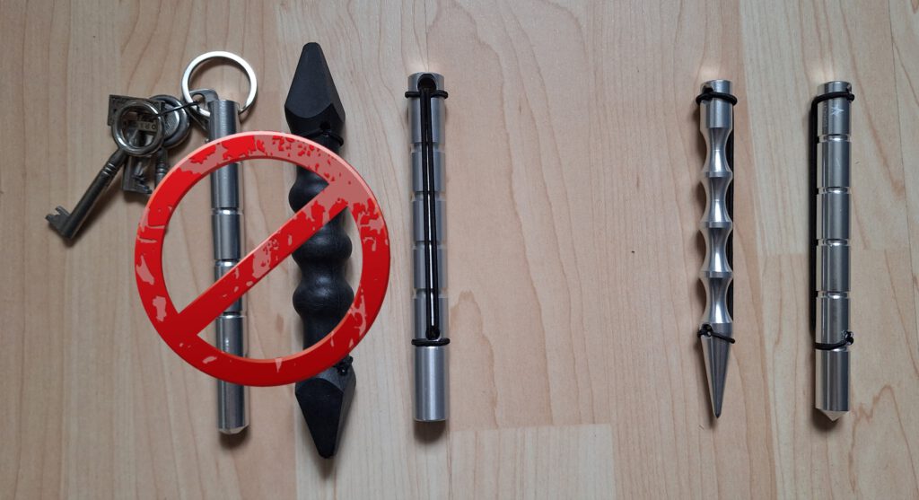 Dirket vorweg: ein Kubotan gehört nicht an den Schlüsselbund (ganz links). Beim zuschlagen hauen mir die Schlüssel selber auf die Finger oder den Handrücken. Ausserdem verliere ich – wenn er im Kampf verloren geht, z.B. wenn ich auf den Boden falle – auch meine Schlüssel. Auch die sehr dicken Kubotana (zweiter von links), sind eher ungeeignet. Sie nehmen viel Platz weg und lassen sich schwer unauffällig führen. Der dritte von links ist komplett stumpf. Der ist ok, besser sind aber die beiden rechten sind besser (der linke für Frauen, der rechte für Männer). Ich kann selbst wenn ich festgehalten werde und wenig Bewegungsfreiheit habe, mit wenig Kraft Schmerz verursachen, um mich zu befreien. Wir sind dazu übergegangen, ein Gummiband am Kubotan zu befestigen. Ich kann ihn, wenn ich denke es könnte Ärger geben, schon einmal an der Hand befestigen, ohne dass er mich beim greifen oder tragen einschränkt. Und ich verliere ihn bei einem Sturz nicht.